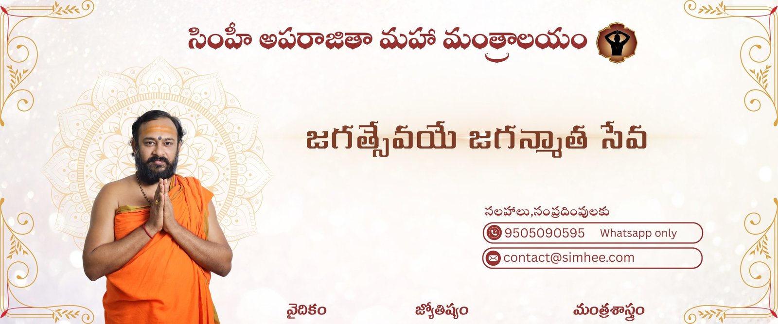 మంత్రశాస్త్ర సాధన ద్వారా ఆధ్యాత్మిక అభివృద్ధి సాధించాలనుకుంటున్నారా? సింహీ అపరాజితా మహా మంత్రాలయంలో మా అనుభవజ్ఞులైన పండితులతో సంప్రదించండి. మేము మీ ఆధ్యాత్మిక ప్రయాణంలో మీకు మార్గదర్శనం అందించడానికి సిద్ధంగా ఉన్నాము.